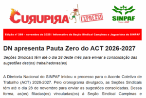 DN apresenta Pauta Zero do ACT 2026-2027 Seções Sindicais têm até o dia 28 deste mês para enviar a consolidação das sugestões das(os) trabalhadoras(es) A